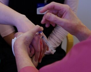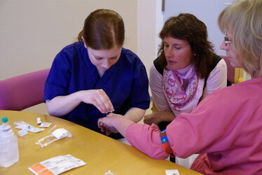 Sykepleier Cathrine Runshaug på Skien sykehjem har fått kollegaens hånd å øve seg på. Hun har akkurat bommet og trukket nålen ut igjen. Hun virker mer nervøs for stikket enn kollegaen som skal få det.