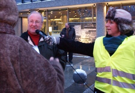 Han overrakte en lønnsoversikt til nestleder i NSF, Unni Hembre under NSFs fakkeltog utenfor NHOs lokaler i går ettermiddag.