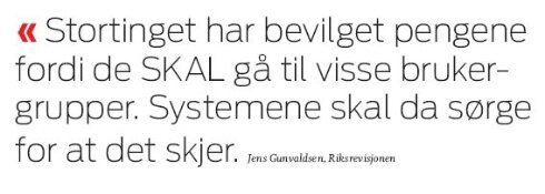 - Stortinget har bevilget pengene fordi de skal gå til visse brukergrupper. Systemene skal da sørge for at det skjer. Det har både departementet og direktoratet ansvar for. Når det svikter, er det alvorlig, sier Gunvaldsen.