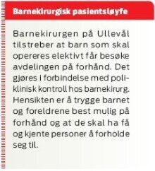 Barna kommer først til kontroll hos barnekirurg på poliklinikken. Dersom det blir bestemt at de skal opereres, følger sykepleier dem opp på avdelingen. Her får de se lekerom og oppvåkningsrom og hilse på. Enten er det sykepleieren fra poliklinikken som informerer dem eller en sykepleier fra posten.