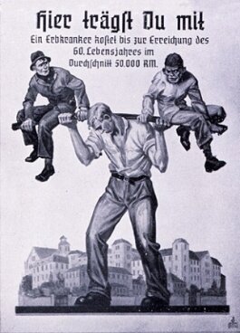 En plakat som ble flittig vist, var bilde av en frisk og sunn tysker som bar en handikappet person på skuldrene. Teksten til plakaten lød: «Det er du som bærer byrden. En fysisk utviklingshemmet koster rundt 50 000 reichsmarks før han fyller 60.»