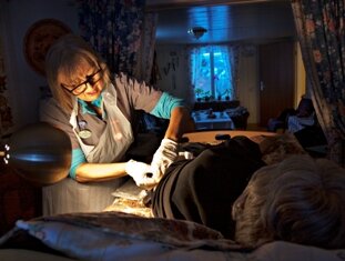 I andre enden av stuen står en regulerbar seng. Nå legger Solli seg til rette og løsner på klærne. Lium hever sengen i god arbeidshøyde. Hun tar på seg forkle og hansker og finner fram utstyret som ligger klart i en skuff. Mens praten går om løst og fast skumres det utenfor. Inne sørger gult lampelys for at kreftsykepleieren kan gjøre jobben sin.