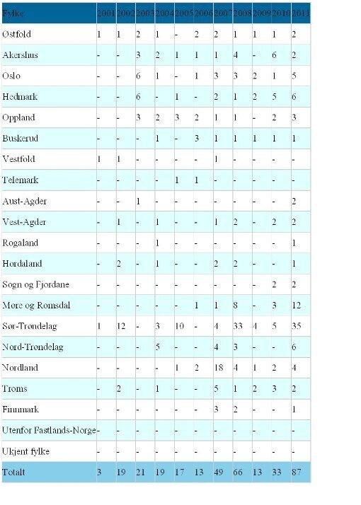 Tabell over de ti siste år med fylkesvis fordeling av Tularemi: