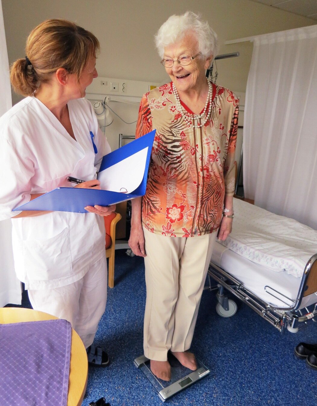 Svanhild Johanna Ringfoss står rak i ryggen på vekta på rommet hun deler med en annen pasient på Medisinsk klinikk ved Sykehuset Levanger. Her er målet at alle innlagte pasienter over 70 år og/eller med kronisk sykdom veies og vurderes for ernæringsmessig risiko.