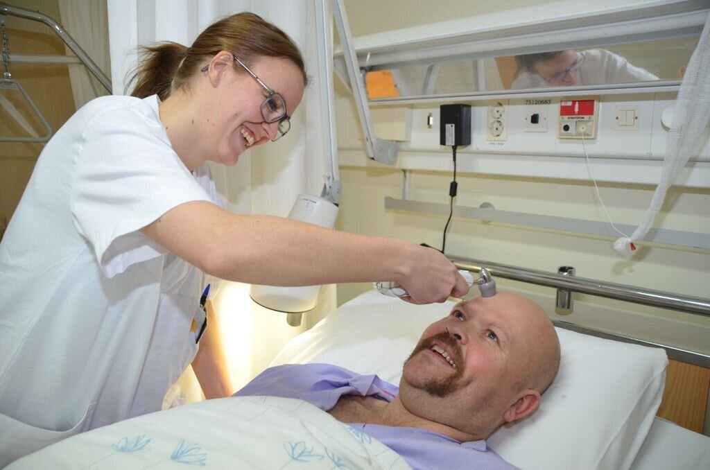 Sykepleiestudent Marit Jacobsen lar temporaltermometeret gli over panna og ned langs tinningene og kinnet på pasient Dag Jørgen Søraa. Hun har sin sjuende uke av totalt åtte i praksis ved kirurgisk avdeling på Helgelandssykehuset i Mo i Rana. Småpratingen deres akkompagneres av morgennyhetene som flimrer over flatskjermen høyt på veggen på dobbeltrommet. Er temperaturen under 36 grader, kan han ikke opereres på grunn av faren for infeksjon.