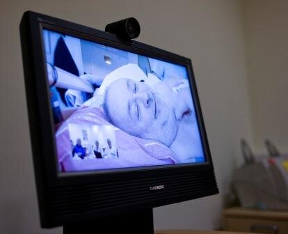 Nå trykker de på noen knapper på en fjernkontroll, og plutselig dukker ansiktet til Bergersen sidelengs opp på skjermen som står på konferansebordet. Bak anes noen kropper, det er hjemmesykepleieren og assistenten som står bak senga hans. Dermed er den telemedisinske sårkonsultasjonen i gang, slik de jevnlig har vært siden pilotprosjektet kom i gang i slutten av mars i fjor.
