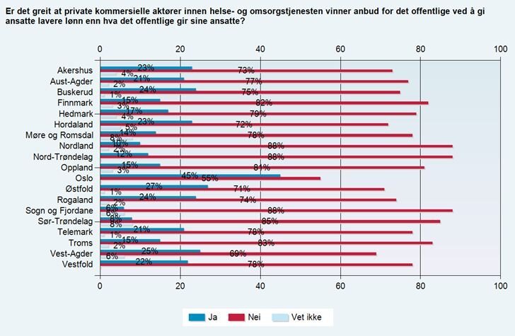 Totalt svarer fire av fem kommunepolitikere at de er negative til at private aktører vinner anbud ved å lønne ansatte dårligere. I alle fylker er det et flertall som mener dette.