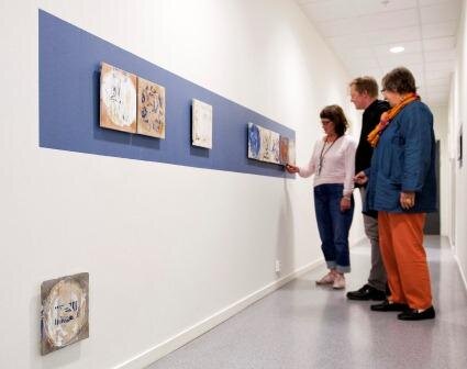 Hun peker mot raden av fliser som henger på veggen i den smale gangen som danner inngangspartiet på avdelingen der hun er pasient. Innimellom kan man skimte et insekt, en fisk eller konturene av et landskap.