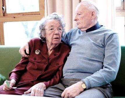 Så går han for å hente samboeren sin, Aud Johnsen, også snart 90 år. Hun både ser, hører og husker dårligere enn før, og setter pris på ei hånd å holde i når hun går.