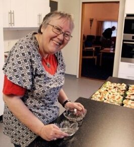 Anne Marie Ausland på 61 år kommer blid som ei sol inn på kjøkkenet. Hun åpner skuffene og finner fram glasskåler for å helle jordbærsyltetøy i. To til hvert av de tre langbordene. Hun har dekket på med servietter og alt. Da hun begynte å komme hit gikk hun med krykker på grunn av gikta. Nå er hun pådekningsansvarlig og har kastet krykkene.