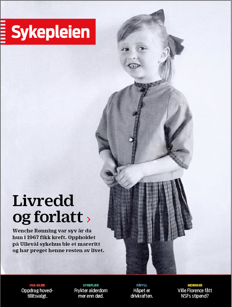 Wenche var bare syv år da hun i 1967 ble innlagt på Ullevål sykehus i Oslo for kreft. Datidens sykehusregime gikk ut på at barn i store perioder ble overlatt til seg selv, uten mulighet til nærkontakt med verken foreldre eller pleiere. Far og mor fikk bare komme en gang i blant, og personalet tenkte mer på behandling enn på nærkontakt. Opplevelsen ble et mareritt for Wenche Rønning. Nå, nesten 50 år etter, beretter om det hun opplevde som barn og hvordan dette preget henne senere som voksen. Det er en sterk historie, sier Tholens. I samme artikkel kommer også en sykepleier som jobbet på Ullevål den gang, til ordet. Hun forteller om et sykehusregime som var vanskelig å bryte med for vanlige sykepleiere. Ledelsen - legene - bestemte.