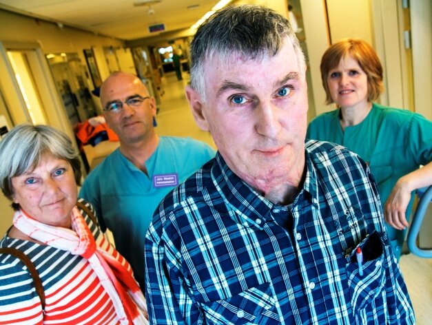 Lillian har vent seg til den nye huden hans, forteller hun, men ikke han. Han synes den er ruglete. Men noen fordeler har de mange hudtransplantasjonene ført til: Før hadde han psoriasis. Nå er den lidelsen vekke.