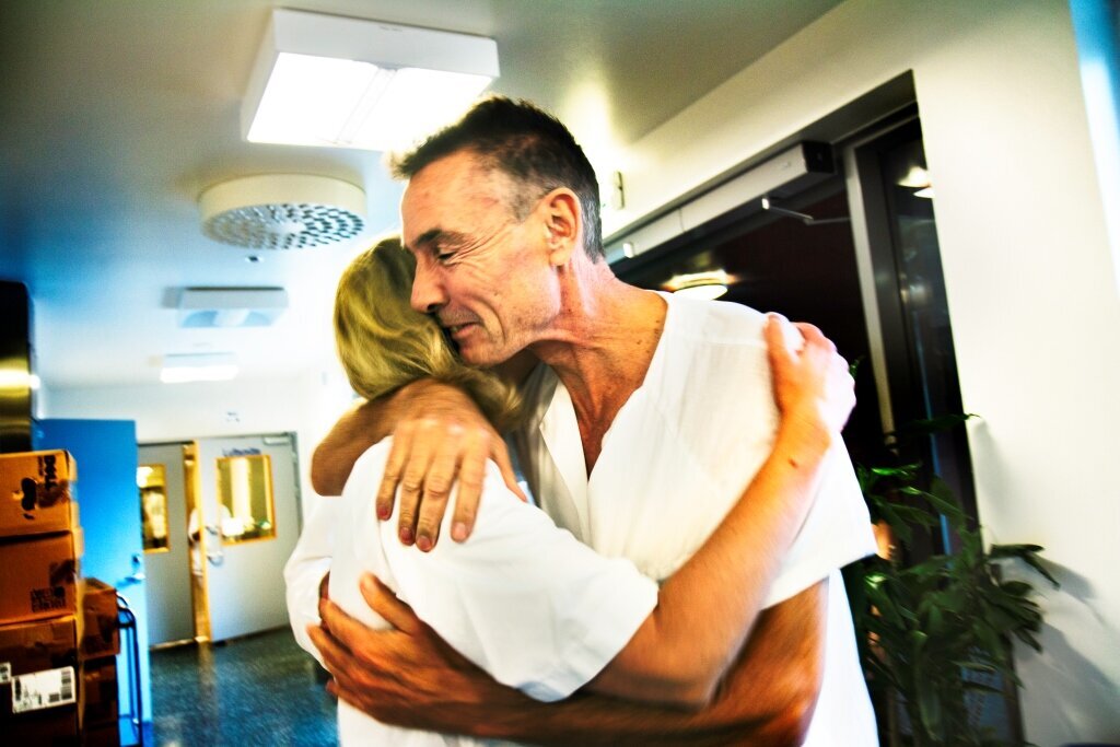 Uti korridoren kommer to leger fra behandlingsteamet. Det blir klemming og latter, og Aftenposten foreviger. Den kjente Morten Rostrup, tidligere leder i Leger Uten Grenser, er en av dem.