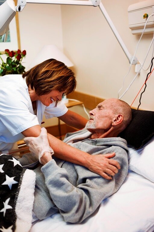 Smertestillende: Spesialsykepleier Tone Sundal gir kvalmenedsettende og smertestillende tabletter til Leif Ragnar Andersen. (Foto: Erik M. Sundt)