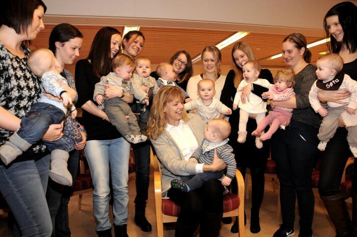 De elleve mødrene har gått på svangerskapsforberedende kurs hos den populære jordmoren, og holder barseltreff annenhver uke.