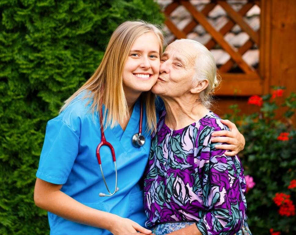 Bildet viser en ung lege som kysses på kinnet av en eldre pasient.