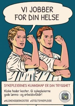 Han forteller at det eneste NSF sentralt har planlagt i anledning Arbeidernes internasjonale kampdag, er å spre det illustrerte slagordet «Vi jobber for din helse – sykepleiernes kunnskap er din trygghet» i sosiale medier sammen med hashtaggene #klokehoderkoster og #stoltsykepleier.