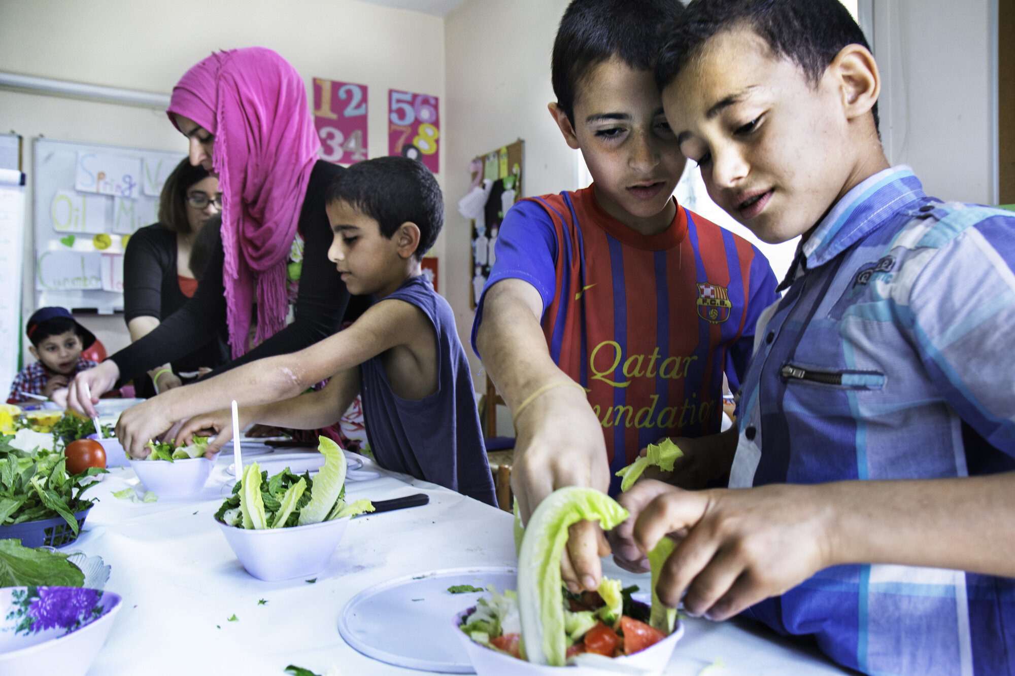Syriske flyktningbarn lager mat på læresenter i Saida, Libanon