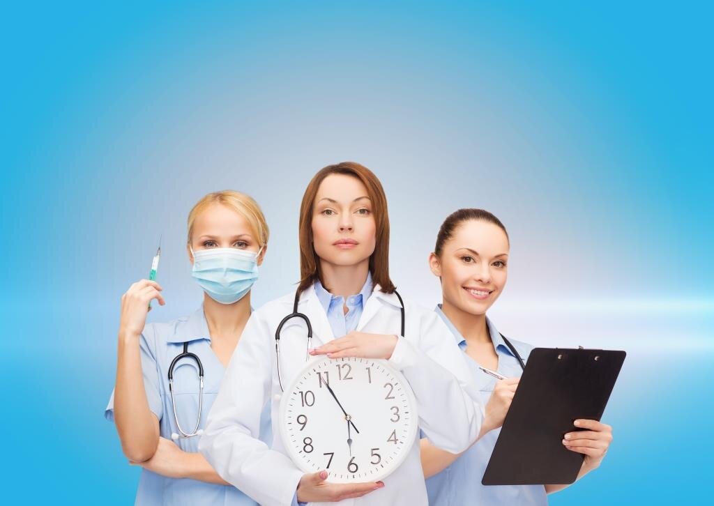 Bildet viser tre sykepleiere. Den i midten holder en klokke.