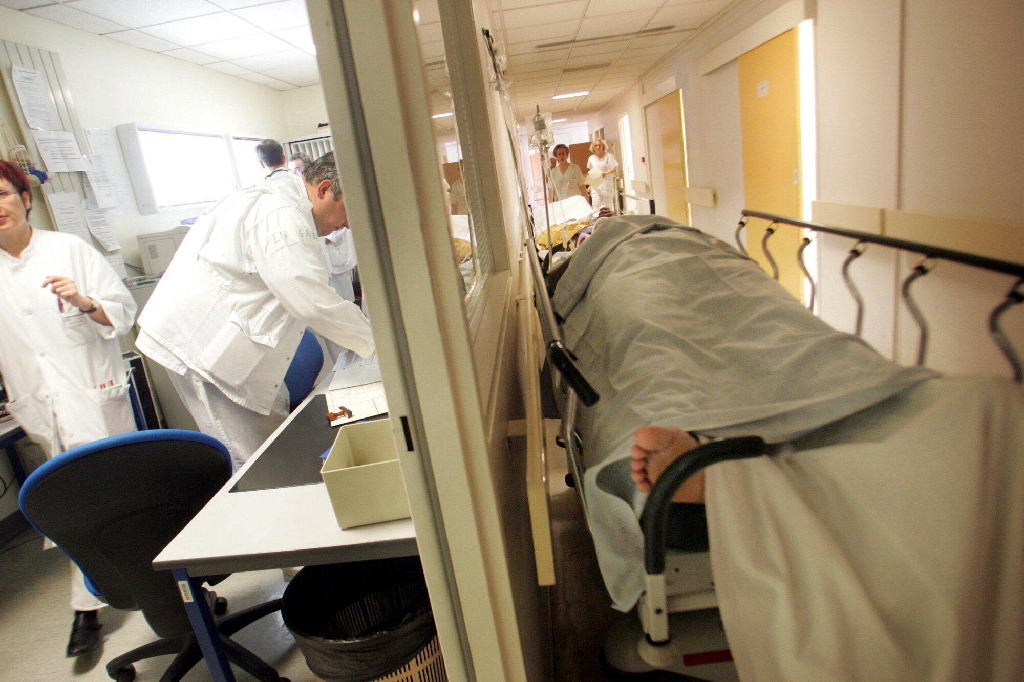 Bildet viser korridorpasient på sykehus. Helsepersonell jobber i bakgrunnen