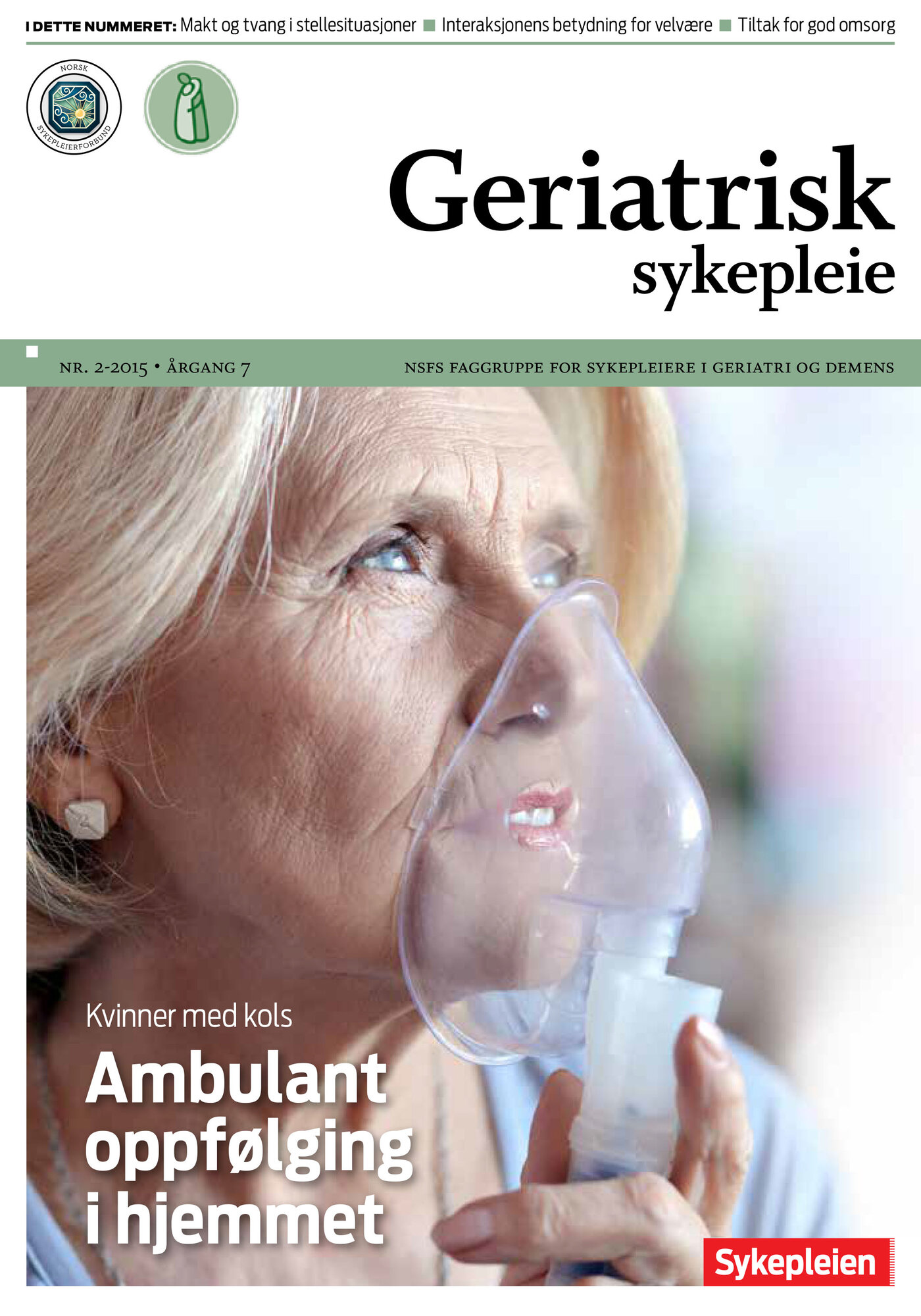 Geriatrisk sykepleie nr. 2 / 2015 2015; 7 (2) Les PDF-utgave (pdf, 3.6 MB) Innhold3 Leder Tor Engevik4 Landsstyret5 Gjesteredaktør Wivi-Ann Tingvoll6 Makt og tvang i stellesituasjoner14 Ambulant oppfølging i hjemmet til eldre kvinner med kols22 Pleier/pasient-interaksjonens betydning for velvære34 Har du spørsmål om demens?35 Viktige tiltak for god eldreomsorgFlere utgaver
