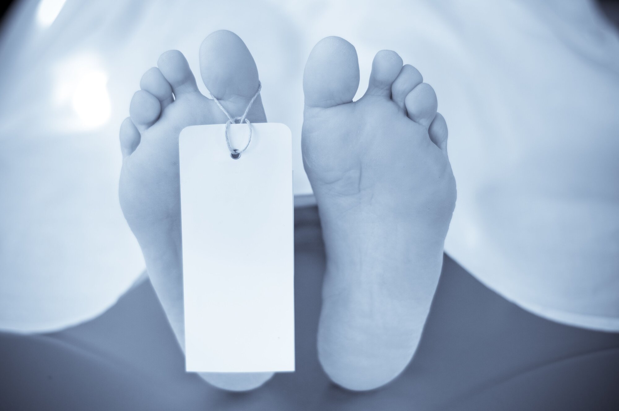 Bilde av føtter på obduksjonstralle med lapp på tåa