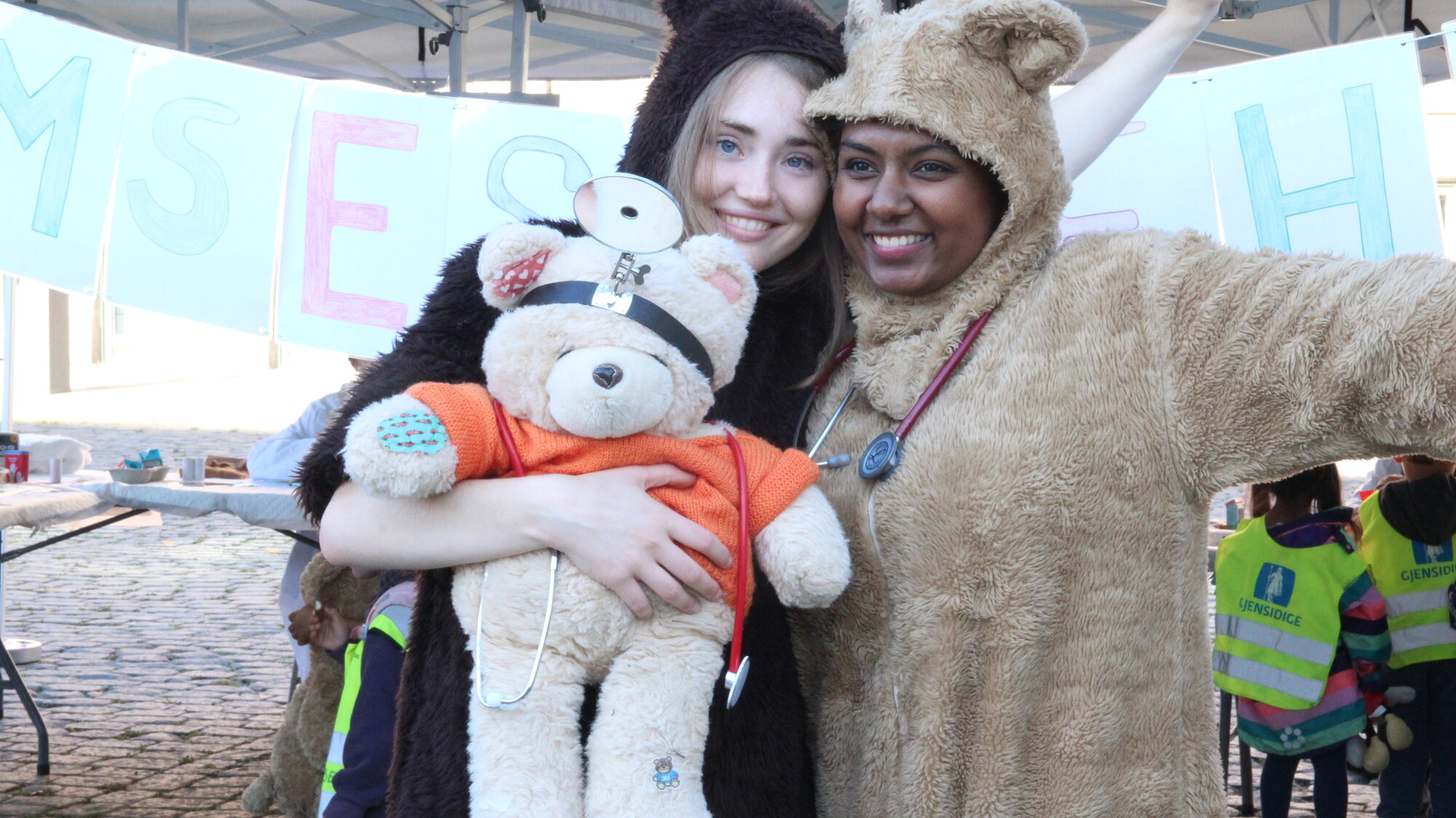 Nareshkumar er leder for Medisinerstudentenes H umanitæraksjon (MedHum) og Irene Aker er for anledningenansvarlig overlege på Bamsesykehuset. Begge har kledd seg i korrekt arbeidsantrekk: Fluffy bamsekostyme.