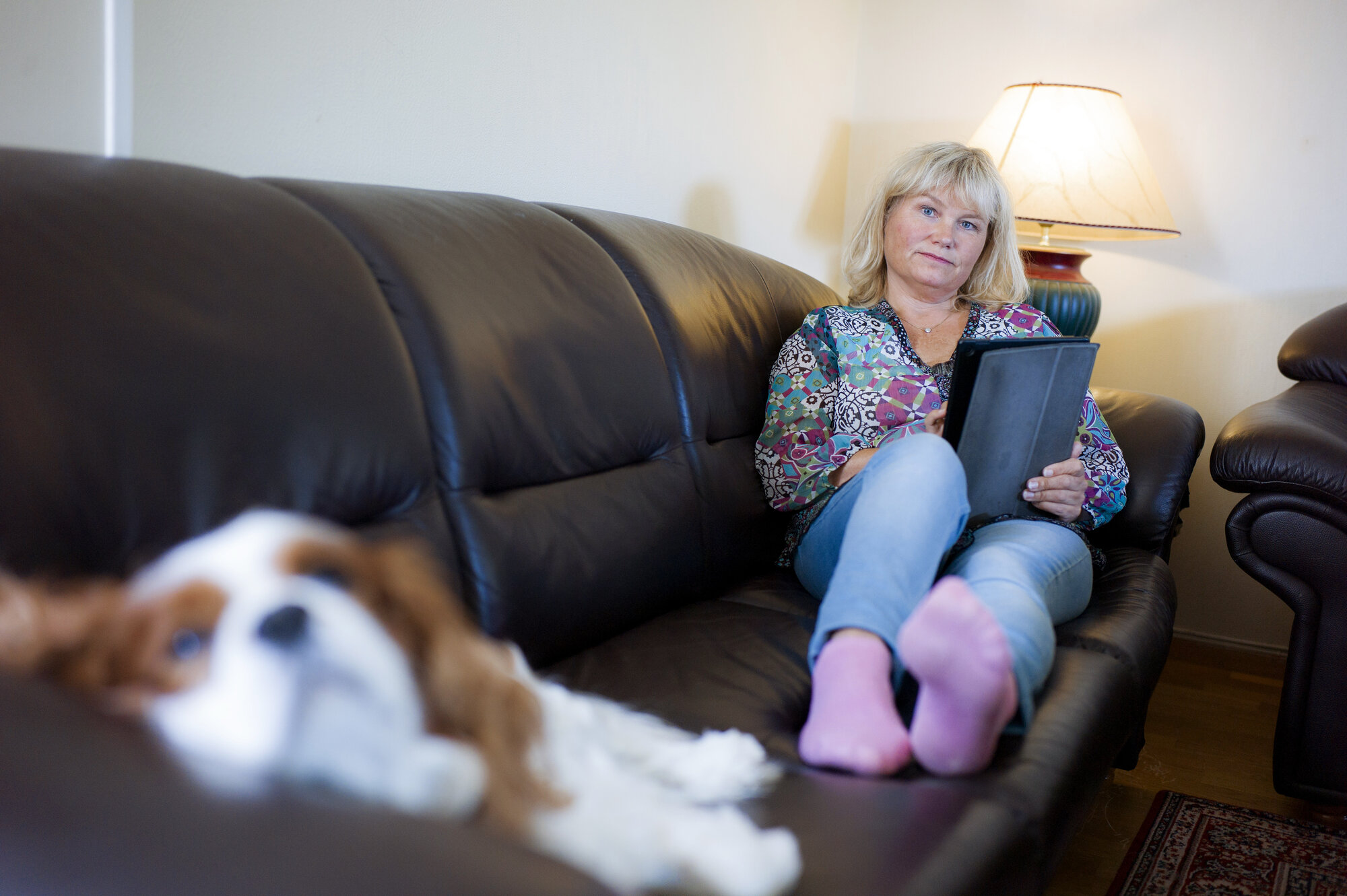 skinnsofaen i stua vært arbeidsplassen hennes. Nettbrett, en
