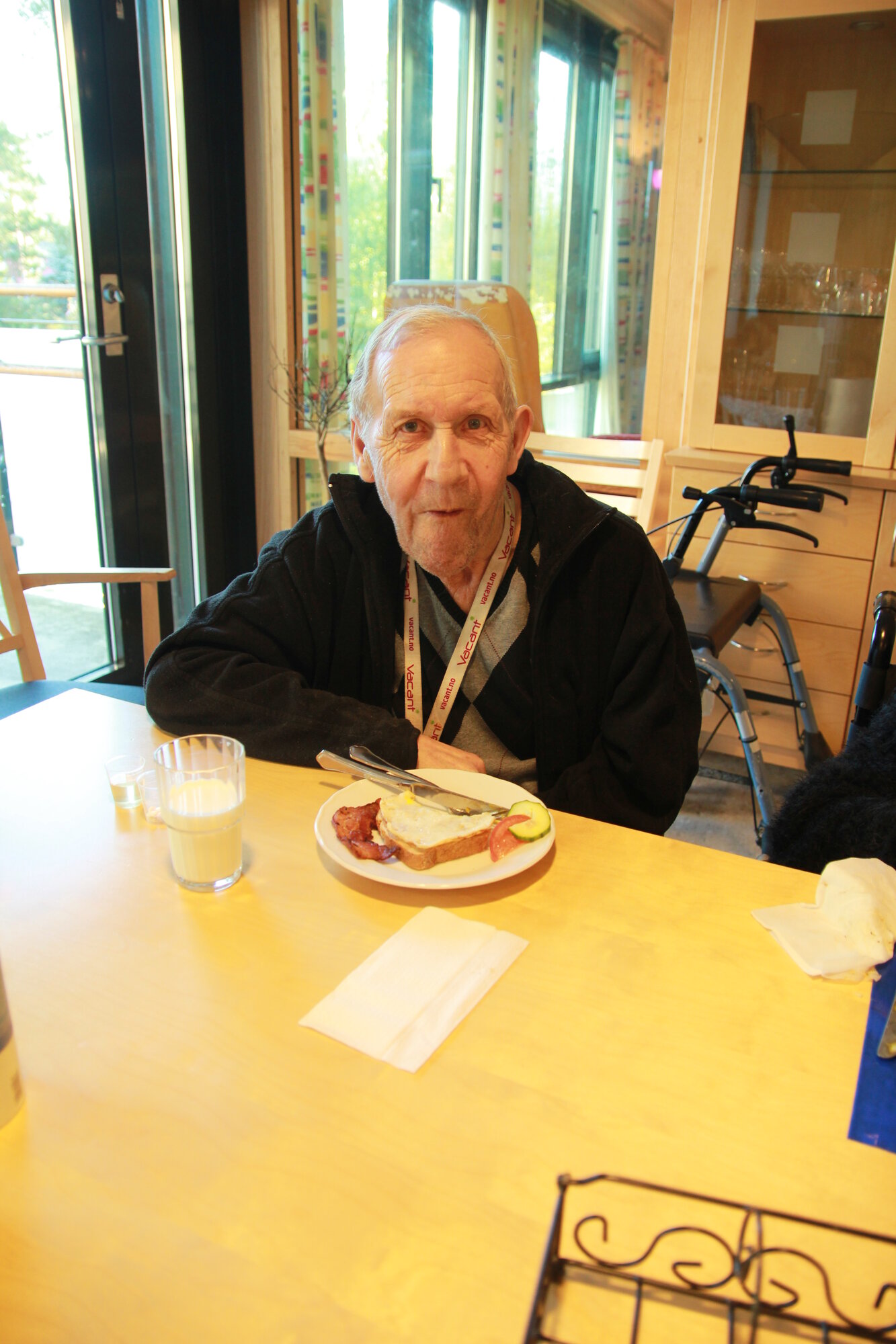 Og det ser virkelig ut som om de koser seg rundt frokostbordet. Alle tar seg god tid til å nyte egg og bacon, juice, melk og kaffe. De fleste får også dagens første dose av medisiner.