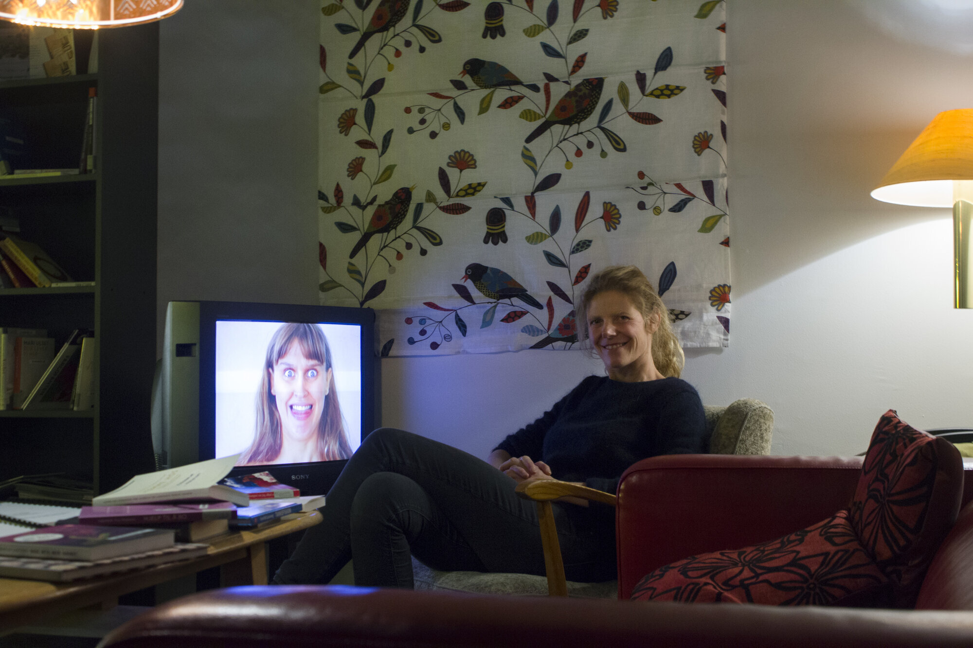 På veggen i det første rommet står det HJEMME HOS. I dette rommet har utstillingen sin begynnelse og slutt . Det er kledd i gamle møbler; en mørkerød lærsofa, et trebord med en hylle under, og en firkanta boks-tv. Et kvinneansikt som skjærer grimaser fyller skjermen og er en del av kunsten som Gro Dahle, Kaia Dahle Nyhus og Ninni Dahle Nyhus har laget i forbindelse med utstillingen.