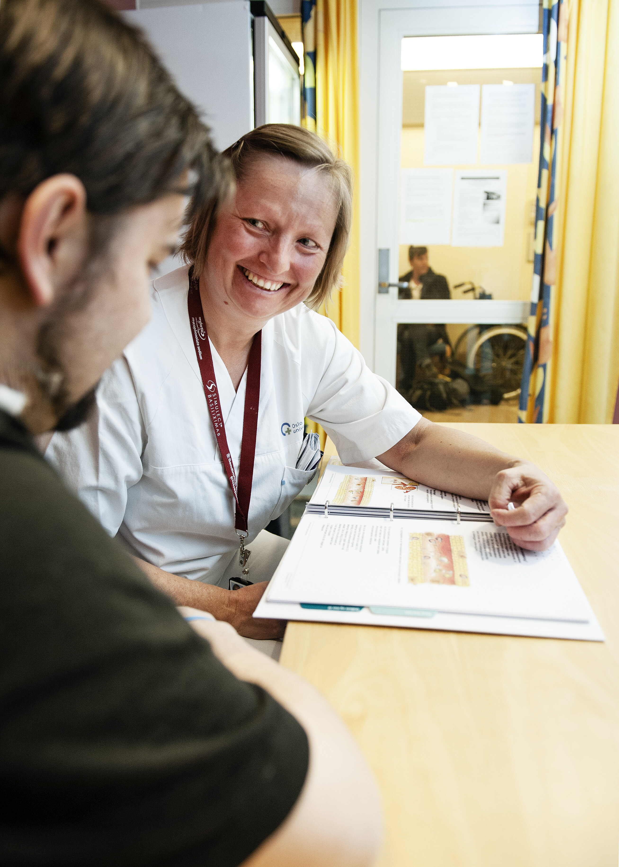 Pasienter som skal til utredning møter til en forventningssamtale hvor vi blant annet snakker om hva pasienten skal igjennom, samliv og hva avstøtning innebærer. Jeg har også akseptsamtaler hvor vi forbereder pasienten på hvordan den første fasen etter operasjonen vil være, men også spenning knyttet til fremtiden. Her prøver jeg å trekke inn pårørende.