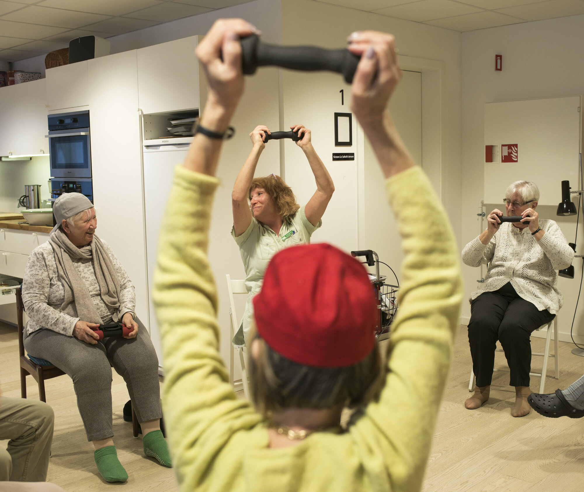 Jane Heisell Lund savner ikke at de ansatte er for seg selv. Hun er godt i gang med dagens mosjon for beboerne. Hjernen skal også ha trim.