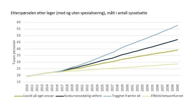 Hun viser til at for eksempel i effektivitetssamfunnet øker etterspørselen etter sykepleiere, jordmødre, spesialsykepleiere og vernepleiere med 70 prosent, mens etterspørselen etter leger øker med 26 prosent og etterspørselen etter helsefagarbeidere, hjemmehjelper og andre pleiemedarbeidere øker med 13 prosent.