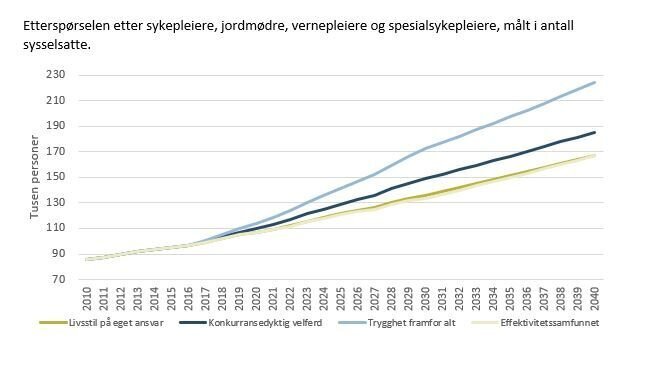 I alle de fire scenarioene kan det bli økt etterspørsel etter sykepleiere.