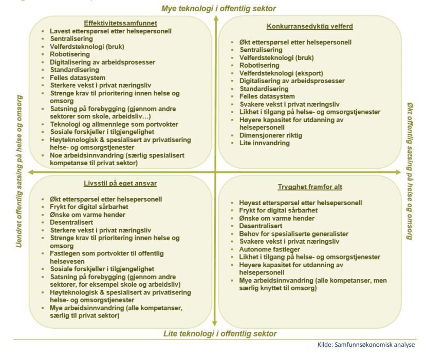 I dette scenarioet vil helse prioriteres på bekostning av andre offentlige tjenester. Det vil være behov for helsepersonell med teknologisk kompetanse.