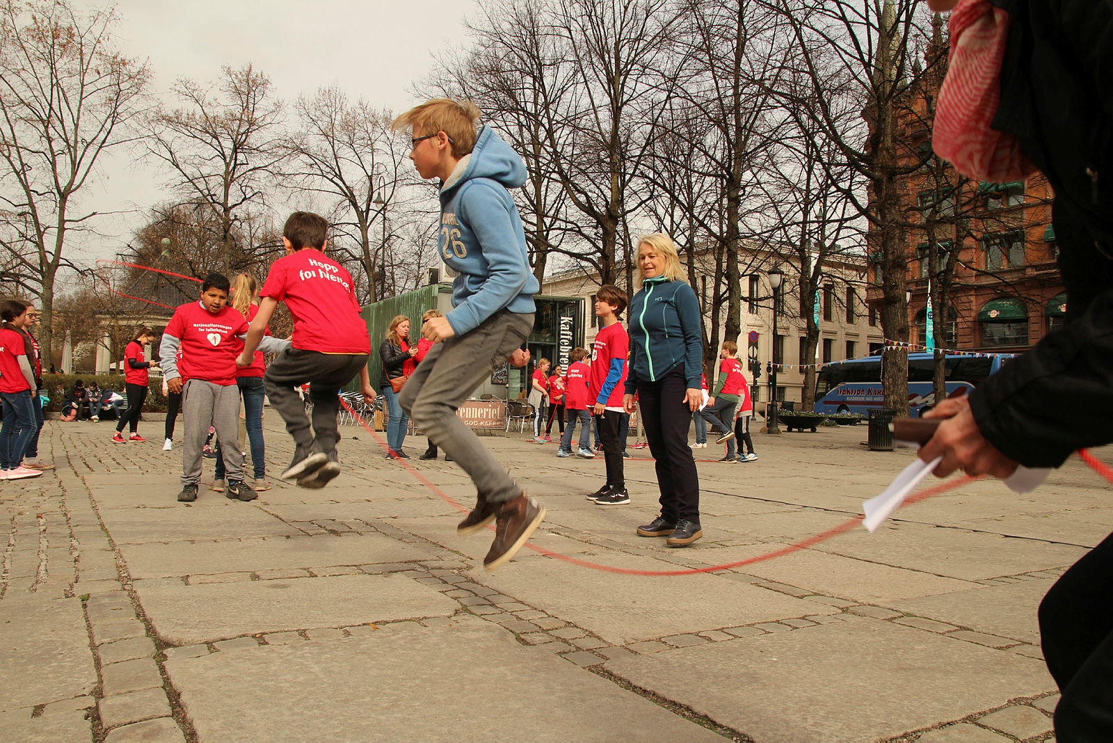 Spikersuppa utenfor Nationaltheatret var tirsdag fylt opp av skoleelever fra Vahl skole. De fikk æren av å hoppe i gang årets hoppetaukonkurranse som startet i dag, 24. april, og varer til 4. mai.