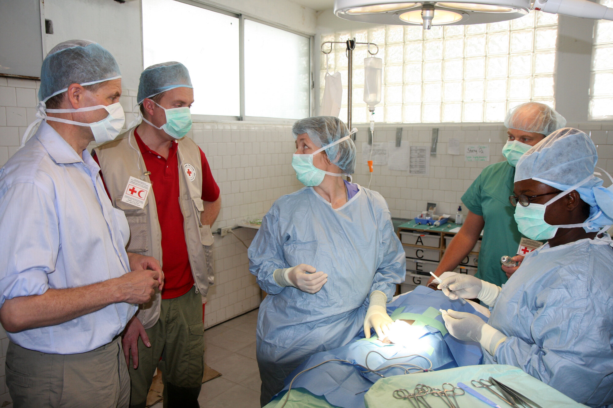 Port-au-Prince, Haiti 20100407. Kirurg Gerd Tranø i aksjon i operasjonssalen på Røde Kors' feltsykehus i Haiti. Utviklingsminister Erik Solheim (tv) og Norges Røde Kors' generalsekretær Børge Brende besøkte sykehuset .