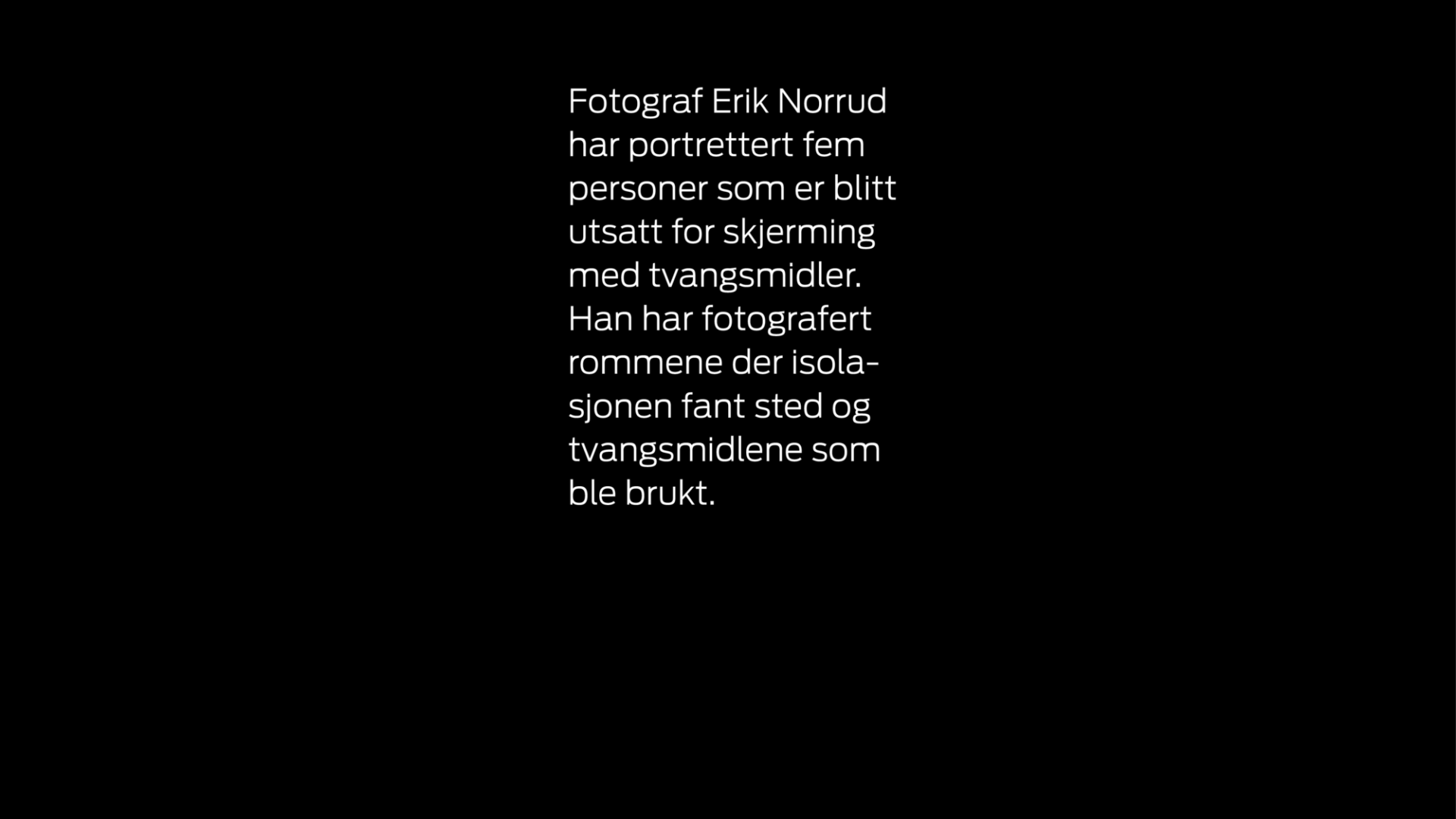 Fotograf Erik Norrud har portrettert personer som er blitt utsatt for skjerming med tvangsmidler. Han har fotografert rommene der isolasjonen fant sted og tvangsmidlene som ble brukt.