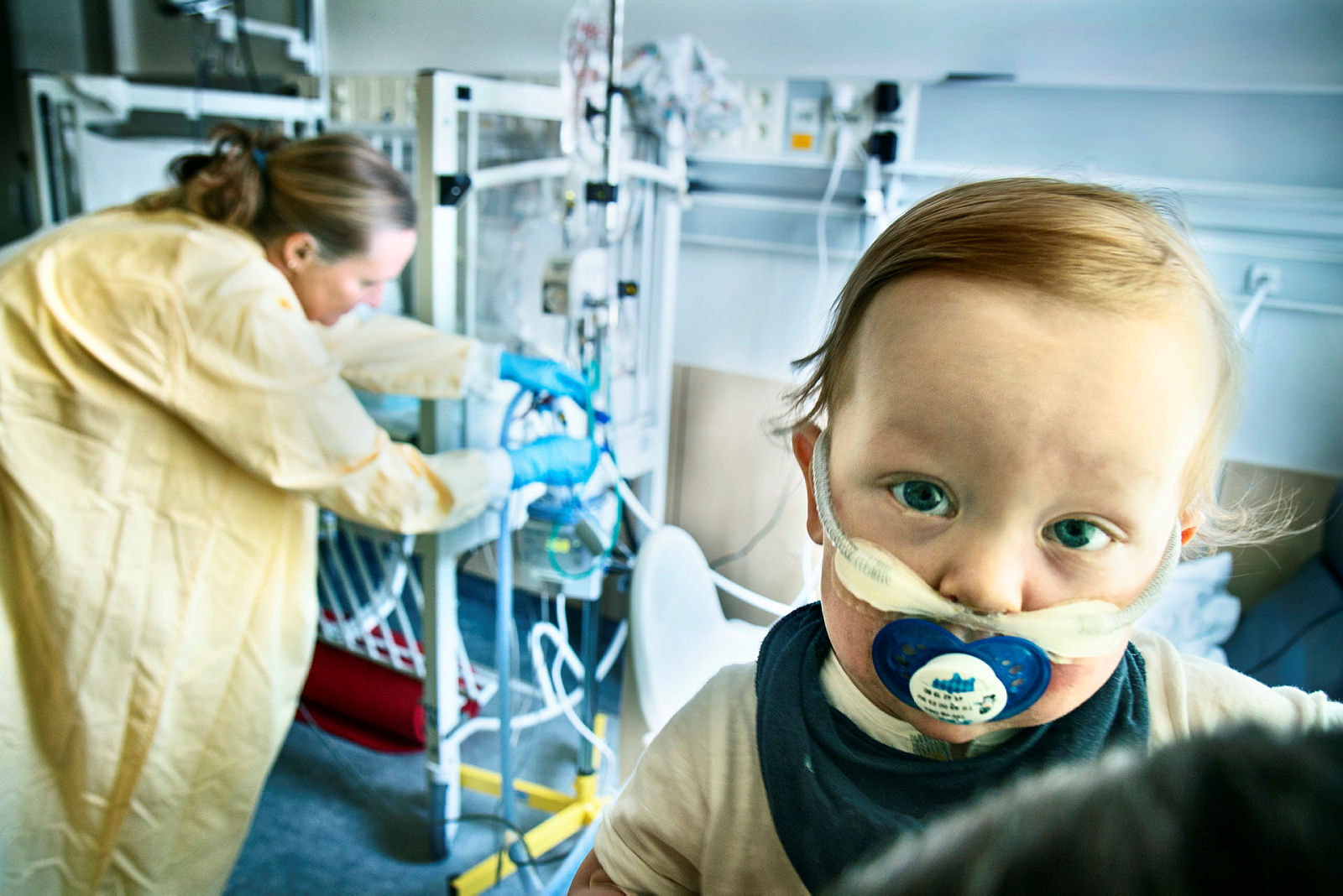 Odin har RS. Et virus som vanligvis ikke er veldig aggressivt for barn som er over ett år. Men Odin, som er født for tidlig, har umodne lunger. Derfor må han ha pustehjelp og ekstra oksygen. Det får han med high flow-behandling, en enkel form for pustemaskin.