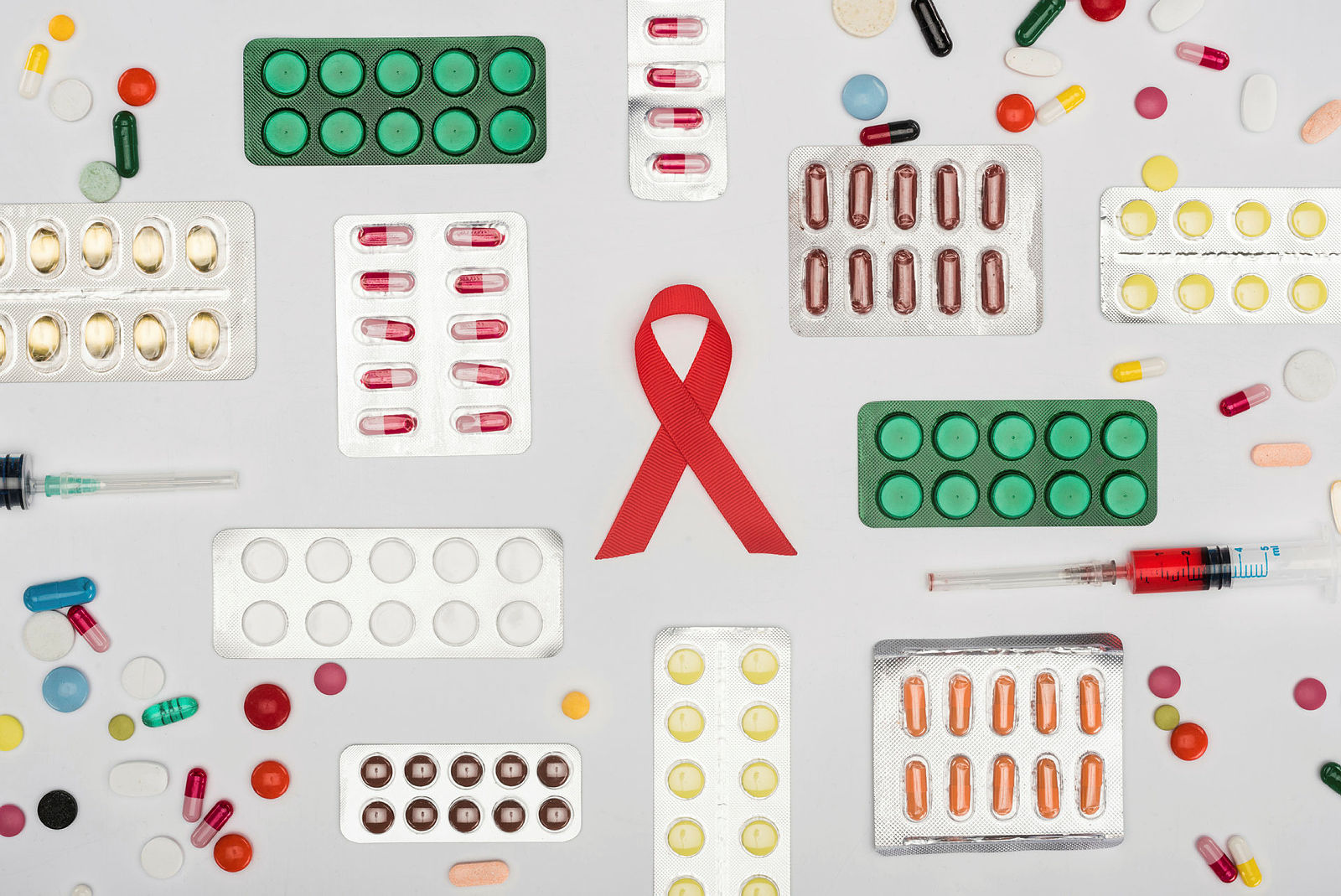 Bildet viser en aidssløyfe omgitt av masse forskjellige typer piller