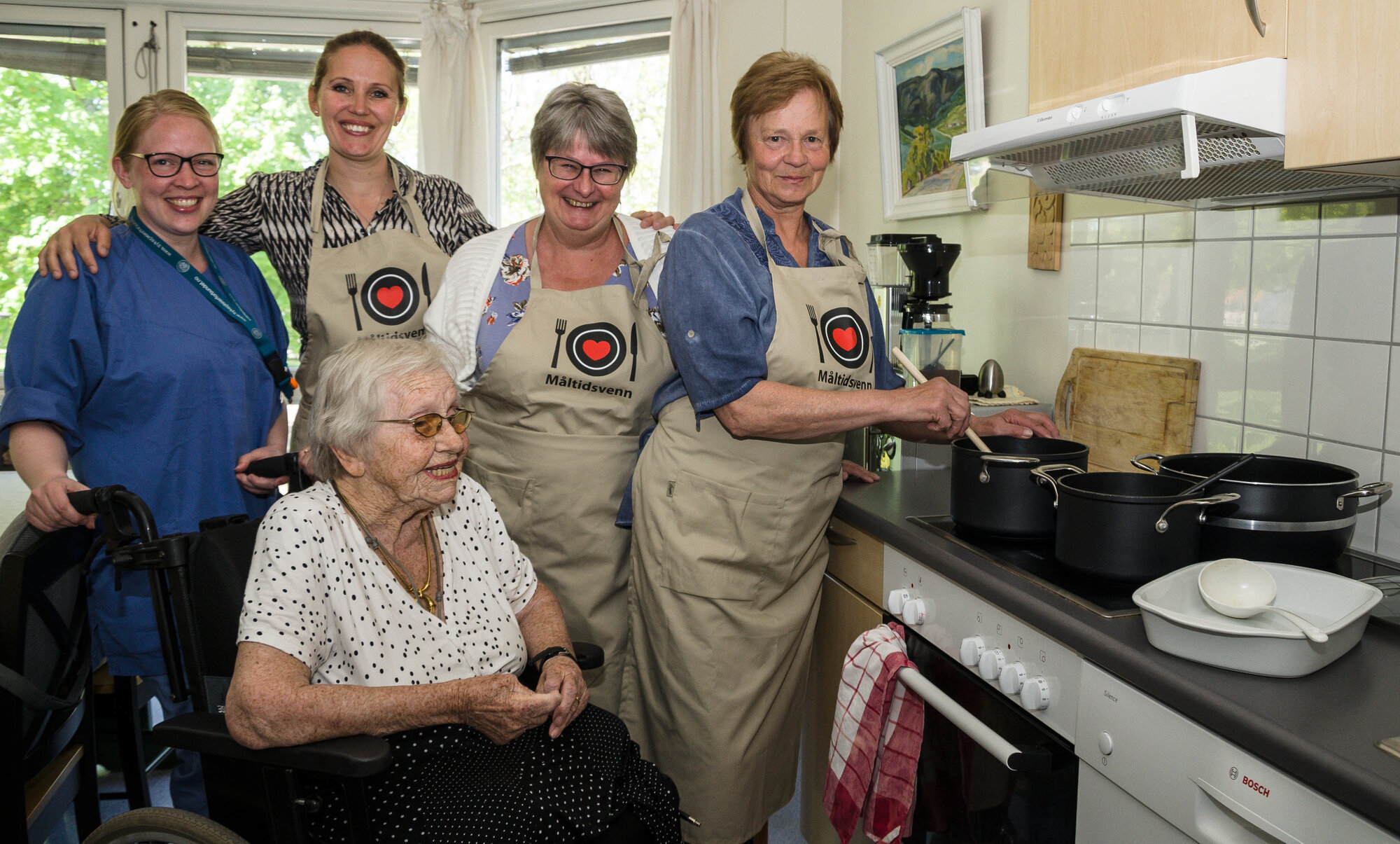Med slike venner får de eldre hjemmelaget mat og selskap mens de spiser.