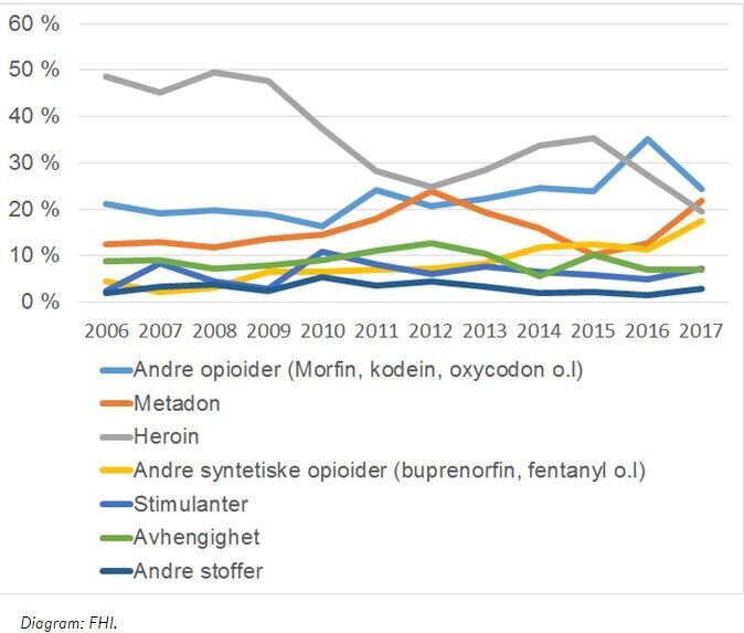 Tallene for de syntetiske opioidene buprenofin, fentanyl og petidin har også steget jevnt og utgjør nå 17 prosent av de narkotikautløste dødsfallene.