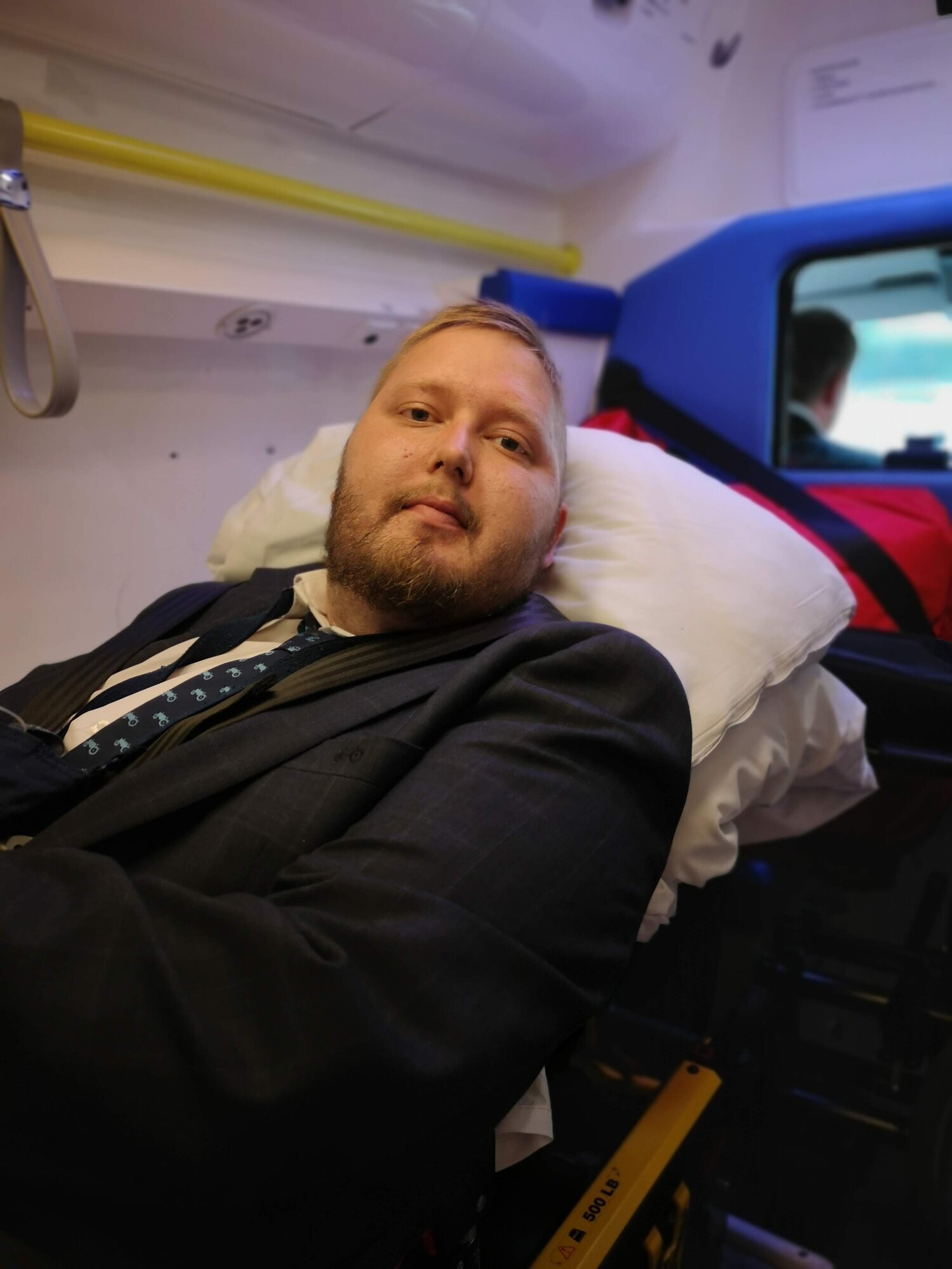 Under transporten til og fra kirken og festen lå han på båre i bilen.