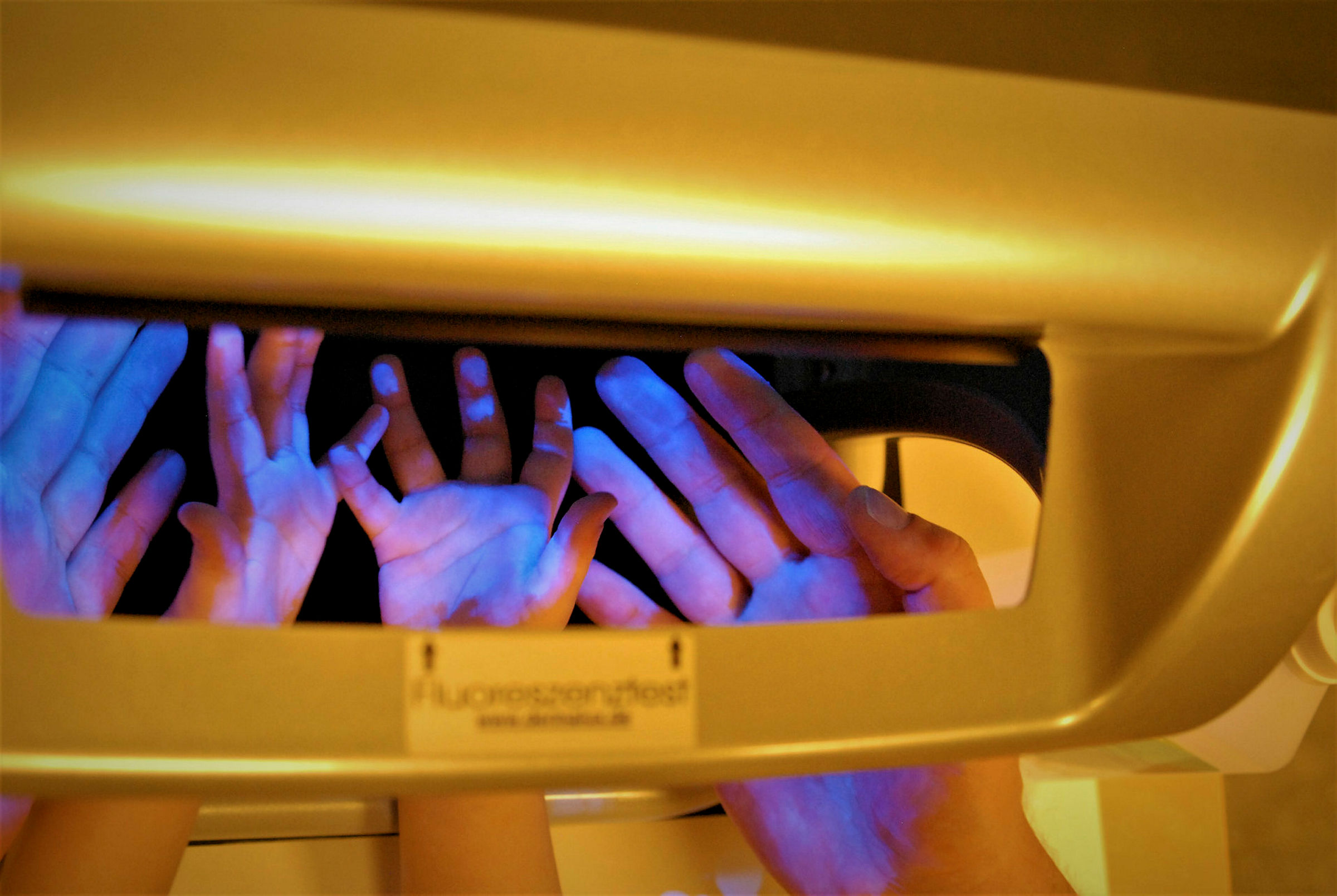 I inngangspartiet står dessuten en snodig innretning med ultrafiolett lys. Det er en lyskasse der du ved hjelp av kontrastvæske kan sjekke hvor godt du dekker håndflatene ved en håndvask eller spriting.