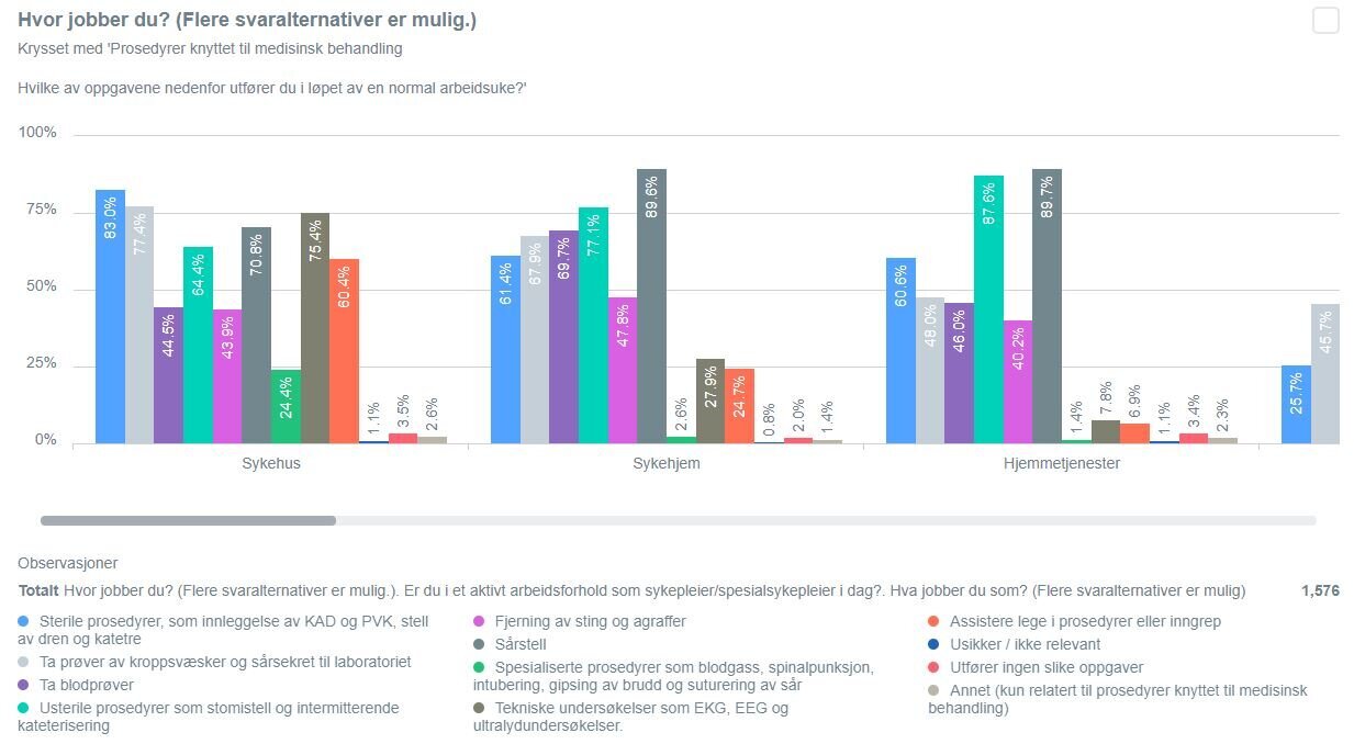 Godt over halvparten av sykepleierne både i sykehus og i kommunehelsetjenesten svarer for eksempel at de legger inn KAD og PVK, steller dren og katetre i løpet av en normalarbeidsuke. (Se tabell nederst i artikkelen.)
