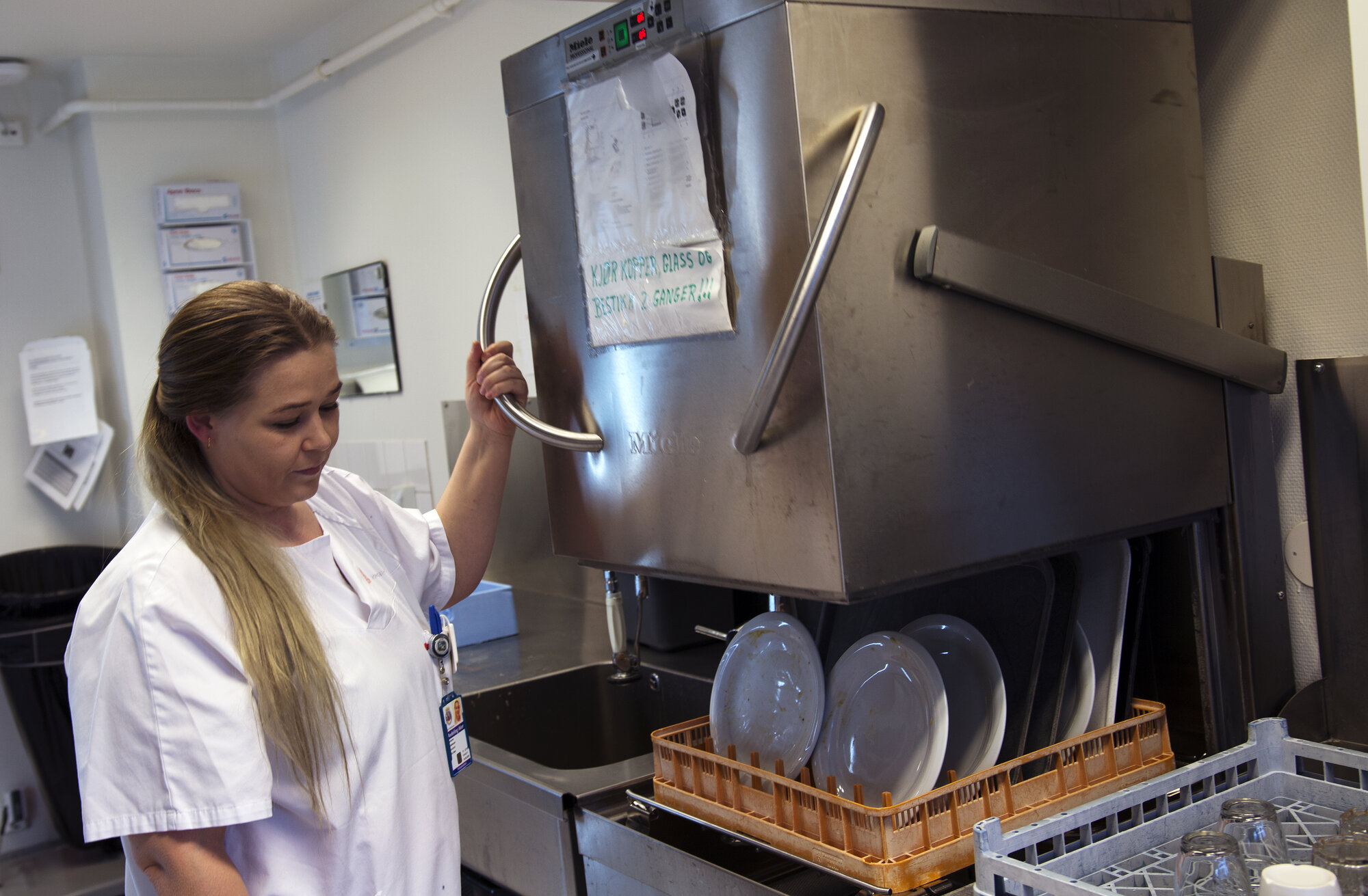 Klokken nærmer seg tre, og sykepleier Karianne Bekkelund kan snart sette det siste brettet inn i oppvaskmaskinen før hun rydder og går av vakt. Hele vakten har hun brukt på kjøkkenarbeid.