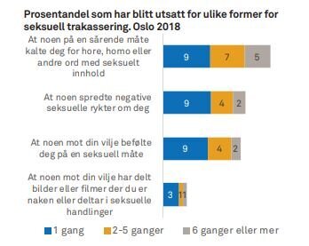I undersøkelsen oppgir 31 prosent av Oslos tenåringer at de har blitt utsatt for enten verbal seksuell trakassering, seksuell ryktespredning, uønsket beføling eller deling av bilder og filmer.