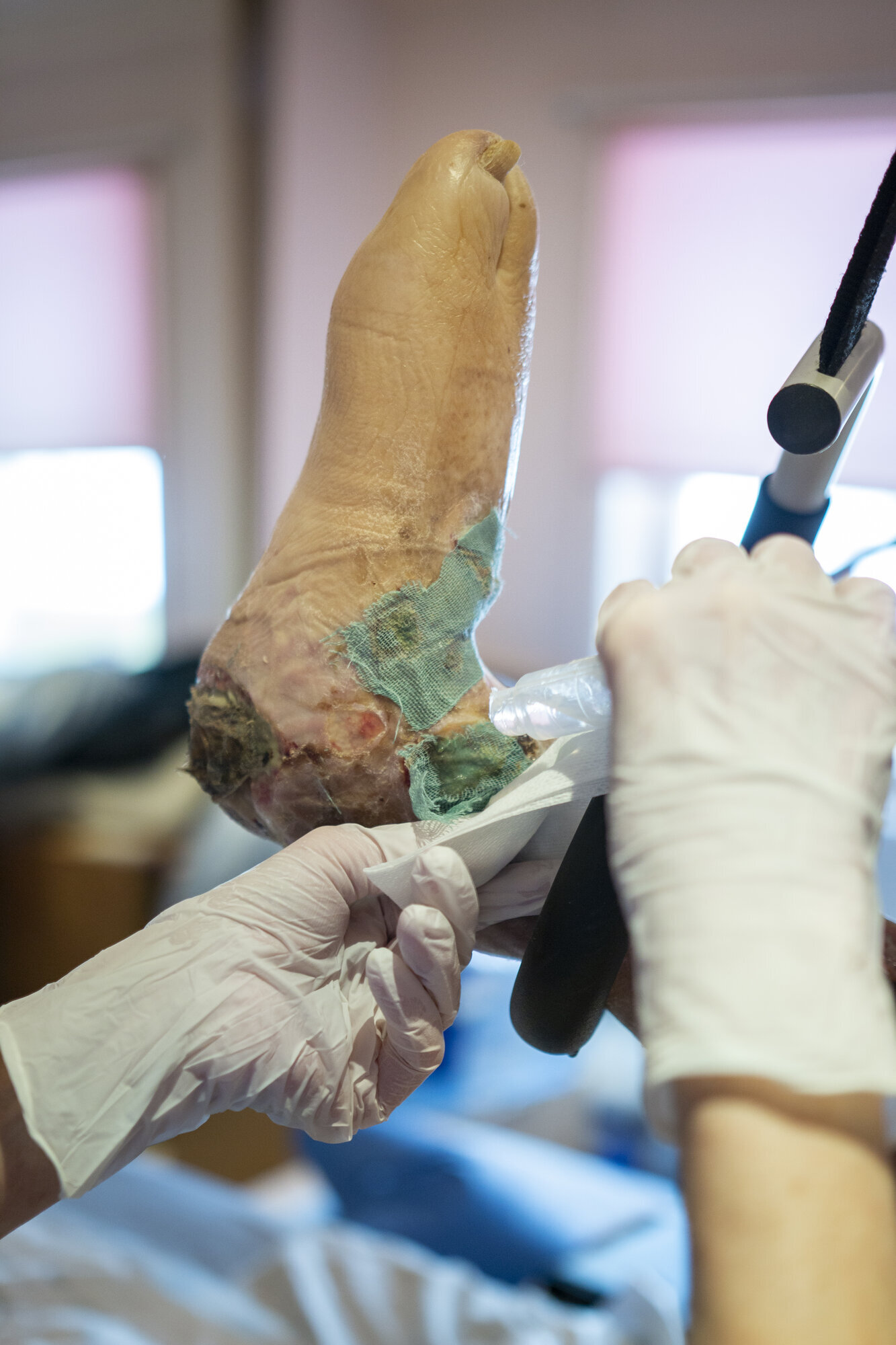 Mens den eldre pasienten ligger i senga, steller hjemmesykepleieren såret på ryggen, liggesåret på hofta, det røde og nakne såret i knehasen, såret på leggen, som det har gått nekrose i, og de mange sårene som til sammen dekker store deler av fotbladet og hælen.