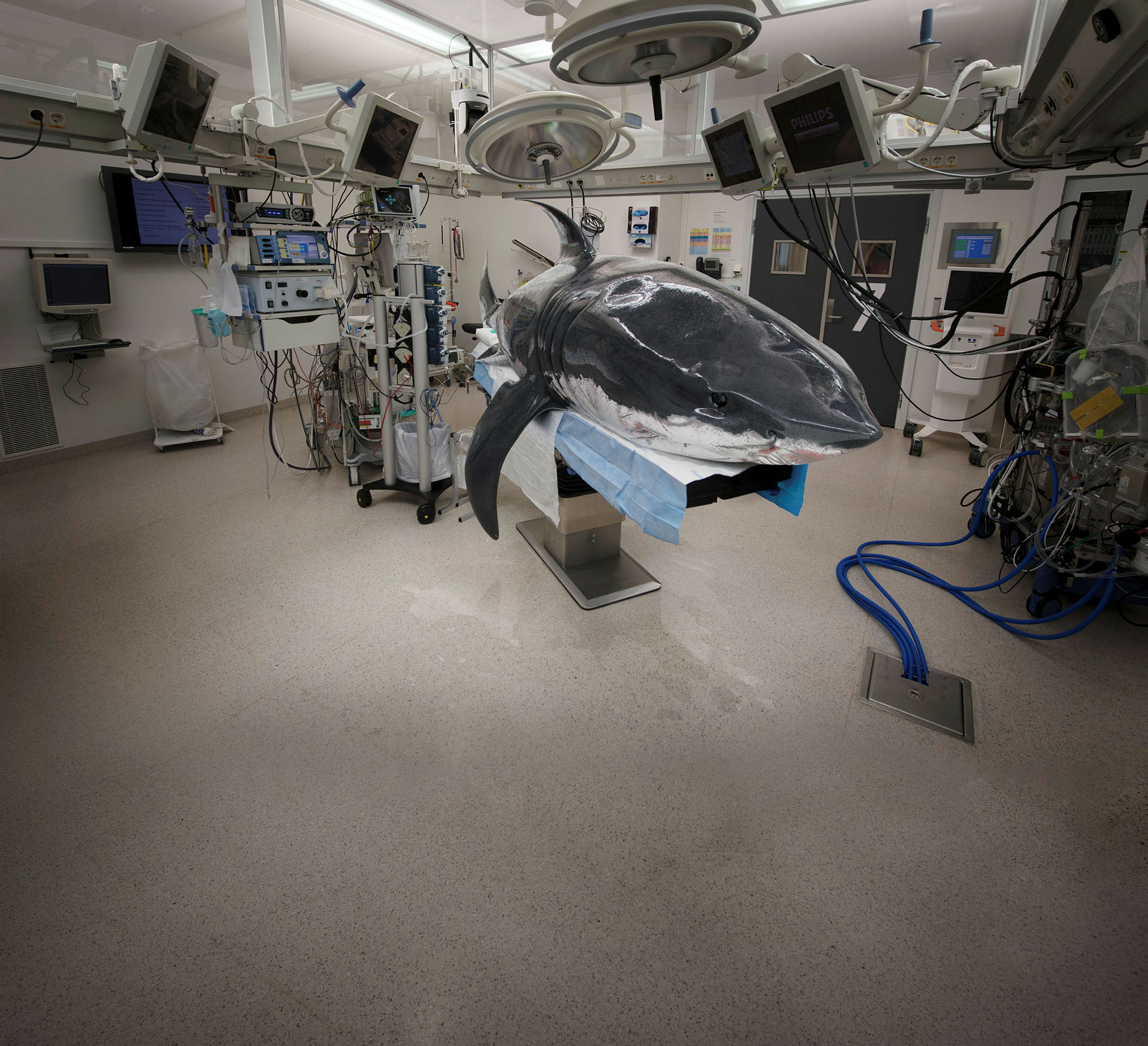 Viser en vaskehjelp i en korridor, hvor en hai "svømmer" rundt