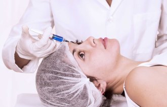 Woman receiving botox injection on her forehead in a examination room